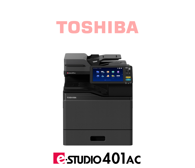 Toshiba e-Studio 400ac – 40 PPM A4, colour system – Functions: print, colour scan, copy, DSDF, 26 cm (10.1”) multi-touch colour panel, 1x cassette, 550-sheet capacity–A5-A4, 60-256 gsm, Bypass, 100-sheet capacity ––100 x 148 mm-320 x 460 mm